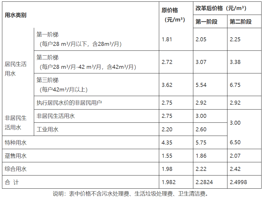 注:调整后的各类供水价格,均不包含水资源税(0.05元/立方米)、污水处理费(居民用水0.95元/立方米,非居和特种用水1.4元/立方米)、垃圾处理费(居民:7元户/月)。